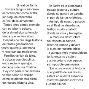 El poema transmite la sensación de pérdida irreversible, pero también la necesidad de mantener viva la memoria. Muriel describe el Real como “testigo mudo y callado donde se vivía y trabajaba”, una imagen que resume el valor simbólico de este enclave, ligado a la almadraba, una de las actividades más antiguas y características del litoral gaditano.