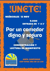 Las familias del CEIP Nuestra Señora de la Luz han convocado una concentración este miércoles 12 de noviembre a las 9:00 h, coincidiendo con la entrada de los alumnos de 1º a 3º, para exigir un comedor escolar digno y seguro. La protesta contará con la lectura de un manifiesto y la presencia activa del AMPA CAMPOMAR, que hace un llamamiento a toda la comunidad educativa: “Tu apoyo es importante: defendamos juntos la calidad y el bienestar de nuestros hijos e hijas”.