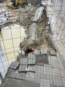 Aunque los hundimientos de pavimento pueden producirse en contextos de obra por factores como movimientos de terreno, filtraciones o alteraciones en redes subterráneas, será la dirección técnica la encargada de determinar las causas concretas y aplicar las medidas correctoras oportunas. Mientras tanto, la zona permanece acotada mediante vallado de seguridad.