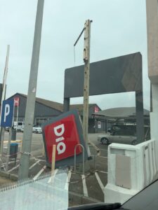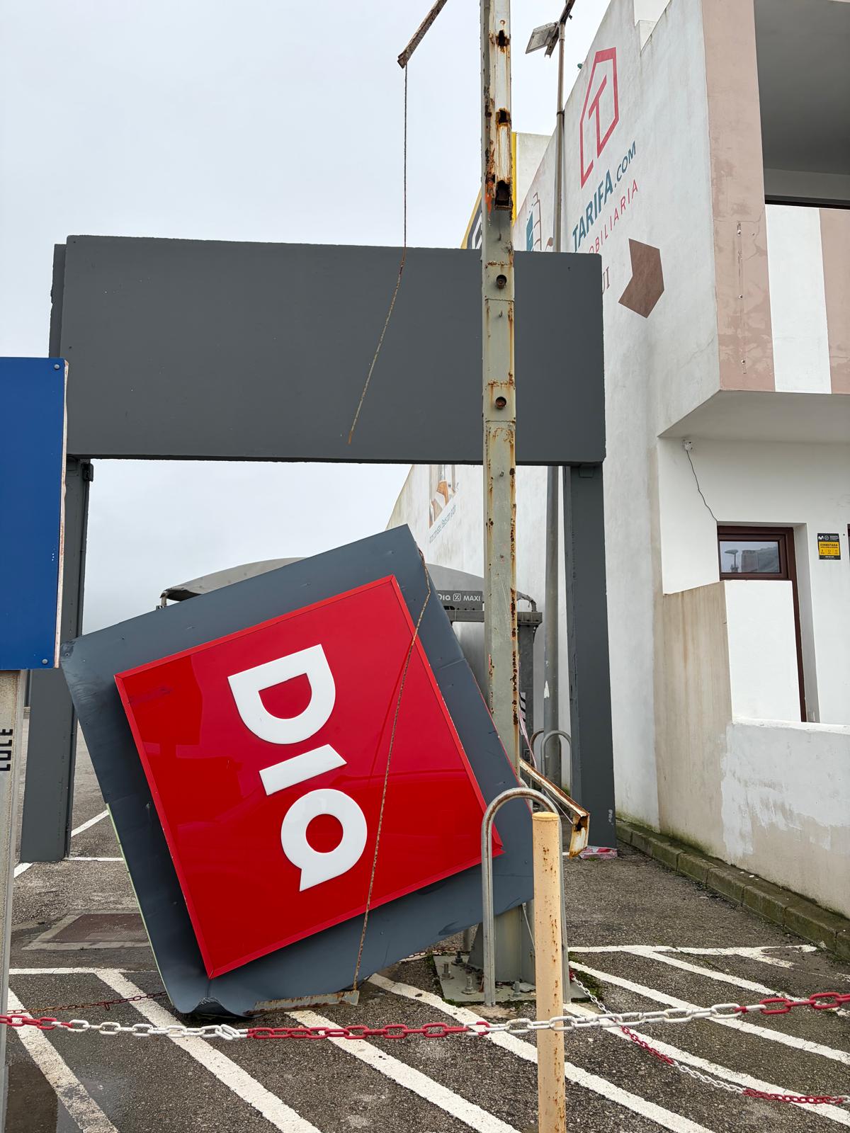 El cartel de un supermercado aparece abatido, vencido por la fuerza del viento tras varios días de temporal. La estructura metálica, aún en pie, sostiene apenas lo que queda del rótulo, mientras el panel principal yace inclinado sobre el asfalto, como una señal muda de lo ocurrido.