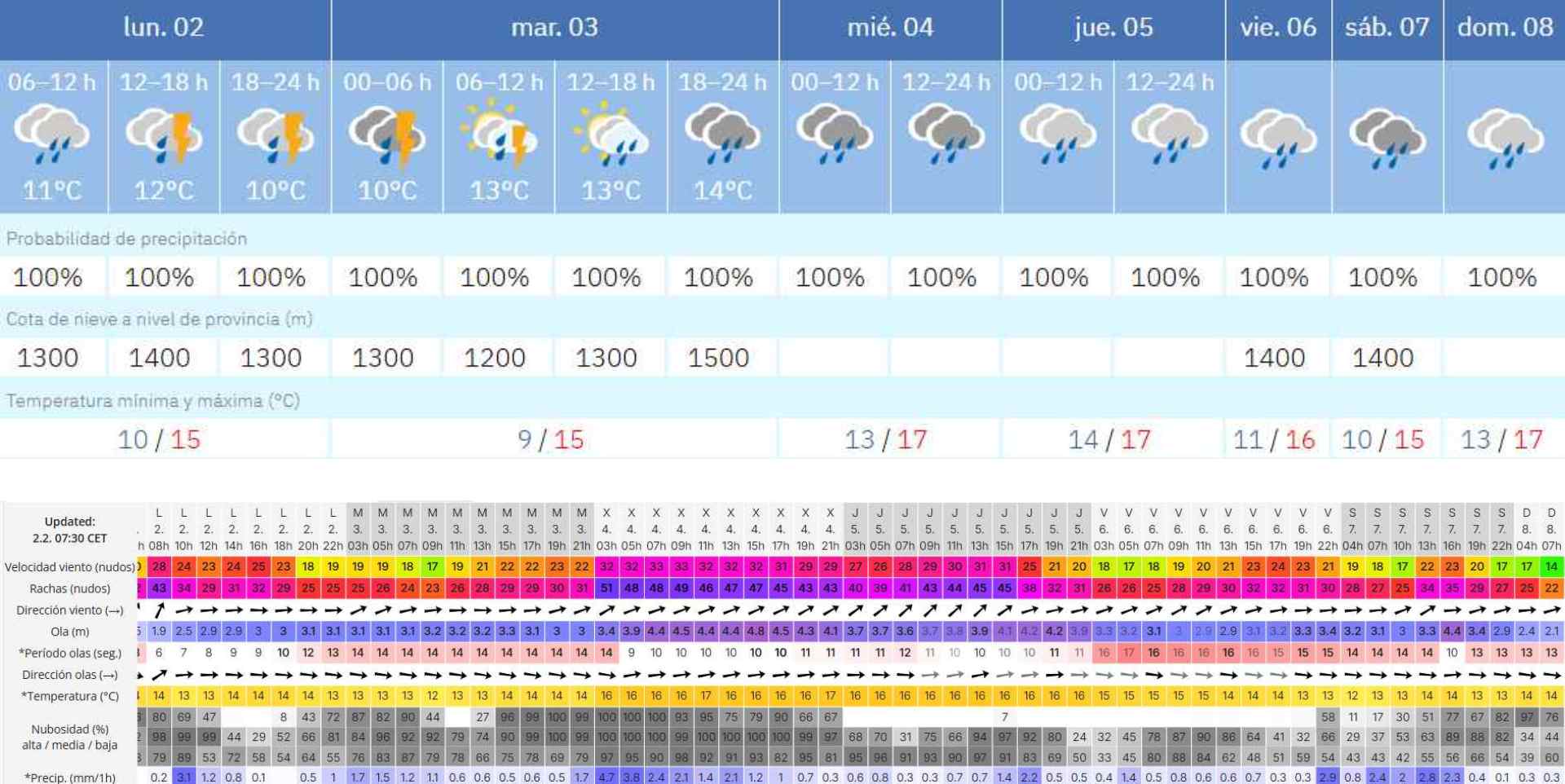 A partir del miércoles y hasta el fin de semana se mantendrá la inestabilidad, con lluvias continuadas y cielos cubiertos. Las temperaturas máximas subirán ligeramente, alcanzando valores en torno a los 16 y 17 grados, mientras que las mínimas se situarán entre los 10 y 14 grados.