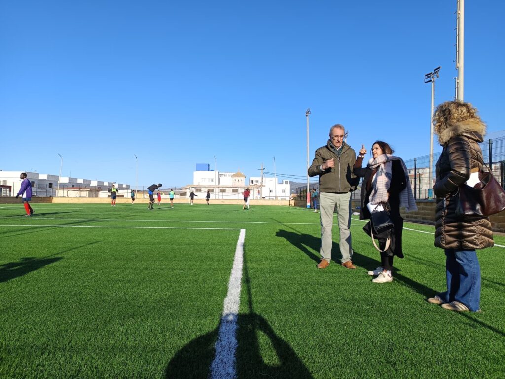 El Ayuntamiento de Tarifa ha culminado ya la mejora y renovación del césped artificial. El alcalde, José Antonio Santos y la delegada de Deportes, Celia Rico comprobaban esta mañana el alcance de la mejora.