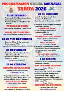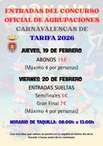 La Delegación de Fiestas del Ayuntamiento de Tarifa ha desvelado la programación del Carnaval 2026, que dará comienzo el próximo 22 de febrero con la presentación oficial de las agrupaciones carnavalescas (13:00 h en la Alameda) y la posterior gala de los premios “Pitos de Oro” (20:00 h en el Teatro Alameda).