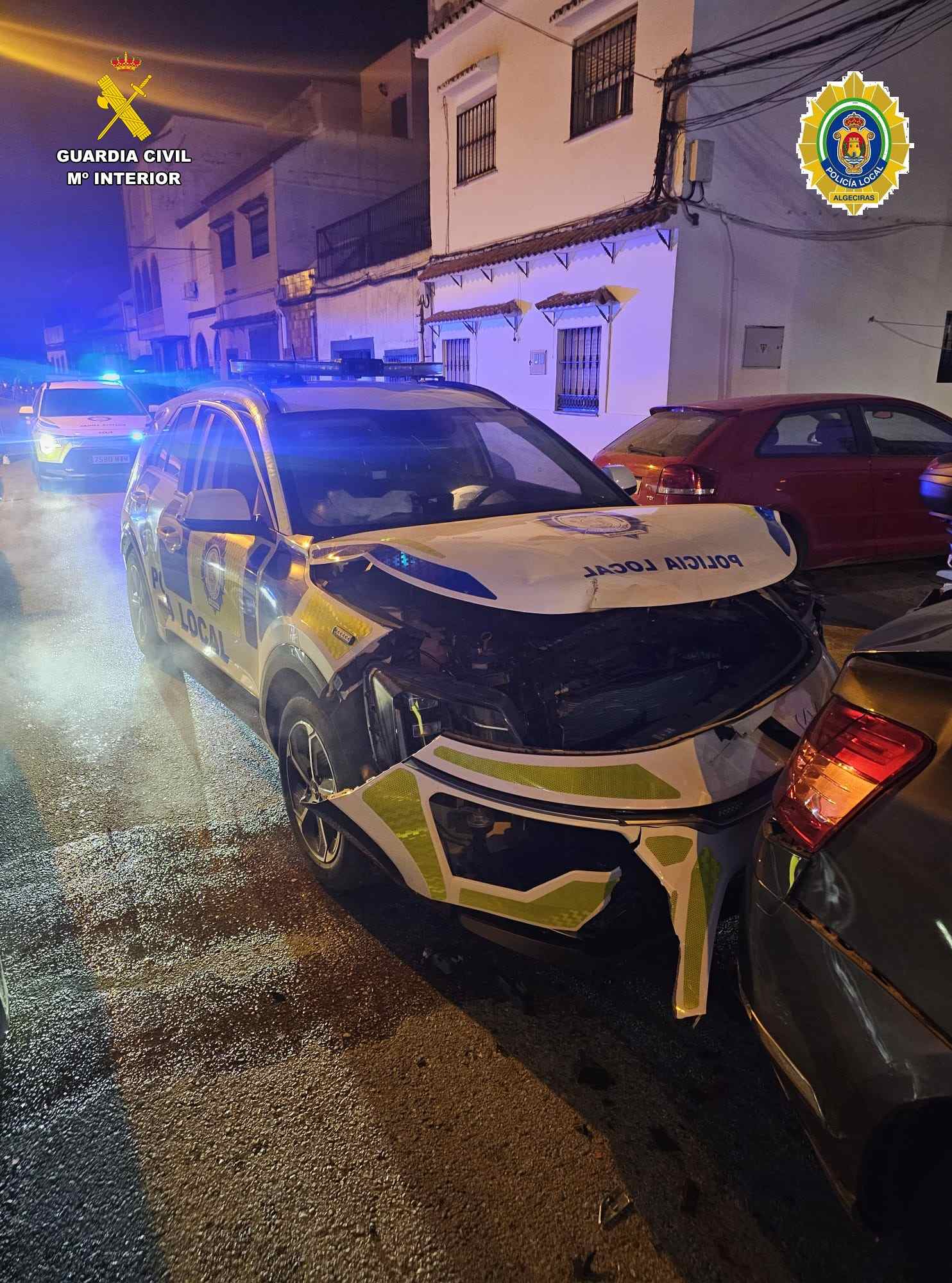 Durante la persecución, el detenido condujo de manera temeraria, poniendo en grave riesgo al resto de usuarios de la vía. Finalmente, acorralado y sin posibilidad de escape, embistió un vehículo policial y colisionó contra varios coches estacionados. Como consecuencia del impacto, dos agentes de la Policía Local resultaron heridos con diversas contusiones y tuvieron que ser trasladados al Hospital Punta de Europa.