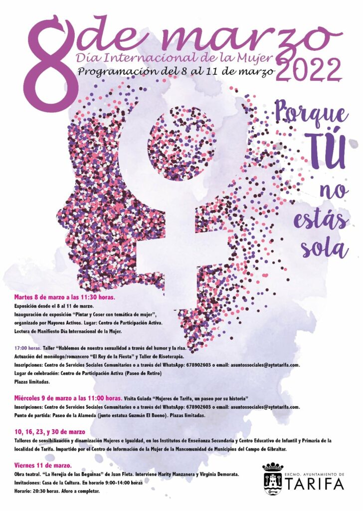 Divulgación y concienciación en el ámbito educativo; implicación social con la participación del programa municipal “Mayores Activos”, entretenimiento y formación son las algunas de las claves a las que atiende la programación presentada este mediodía para conmemorar el 8 de marzo, Día Internacional de la Mujer. La agenda impulsada por el Ayuntamiento de Tarifa a través del área de Igualdad se prolongará entre el propio 8 de marzo y el viernes, día 11 de marzo.