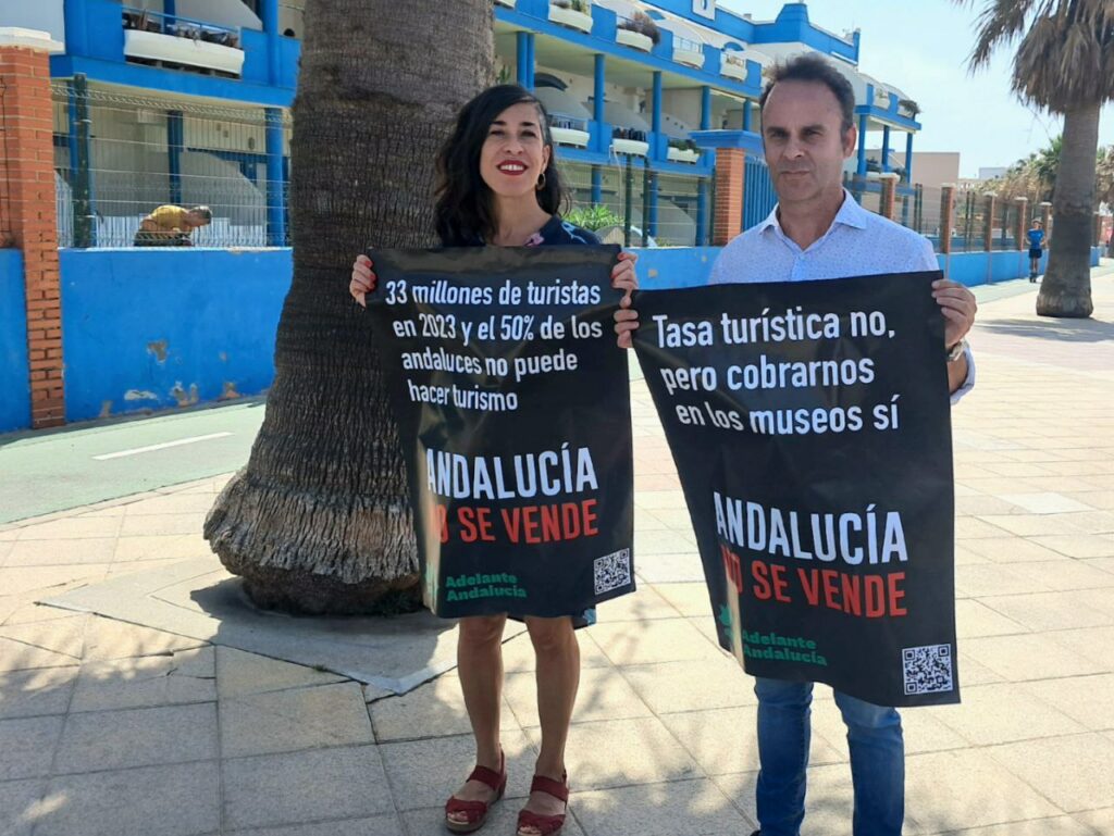 Los coportavoces de Adelante Andalucía en la provincia de Cádiz, Leti Blanco y Alejandro Gutiérrez, han presentado hoy la campaña contra la turistificación ‘Andalucía no se vende, Andalucía se defiende’ en Tarifa, precisamente, porque es “un ejemplo paradigmático del turismo depredador que estamos denunciando”, ha explicado Gutiérrez. “Hoy lo decimos desde el Campo de Gibraltar alto y claro: no estamos en contra del turismo, pero sí de este modelo de turismo, que expulsa a nuestros vecinos y vecinas de nuestros barrios, que destina más del 90% del parque de viviendas al turismo, que genera un modelo de empleo precario, estacional y que no tiene en cuenta nuestros recursos medioambientales”.