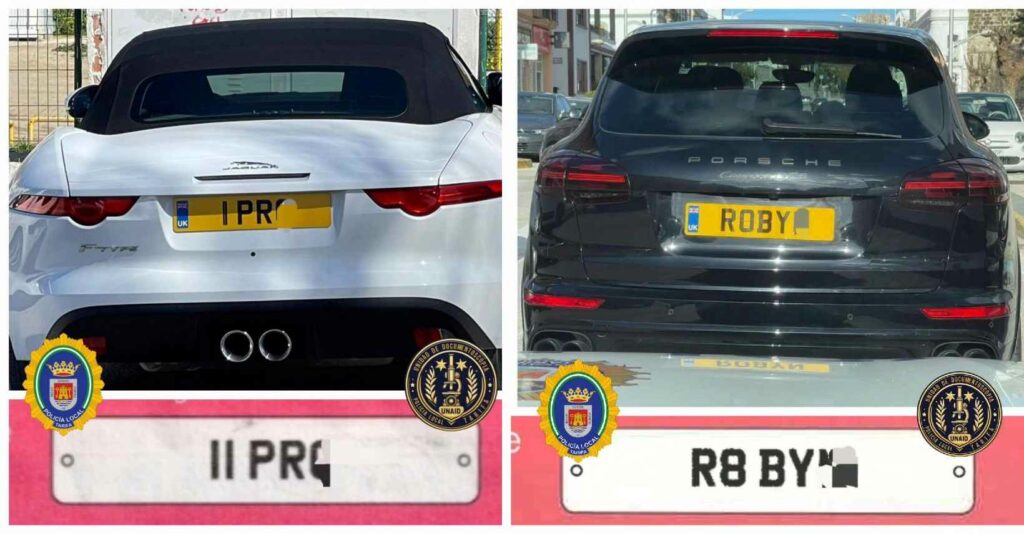 Detenido en Tarifa por la Policía Local, al falsificar las matrículas de sus vehículos. El autor de esta chulesca falsificación hizo coincidir su nombre propio, en el Porsche y en el Jaguar con sus iniciales.