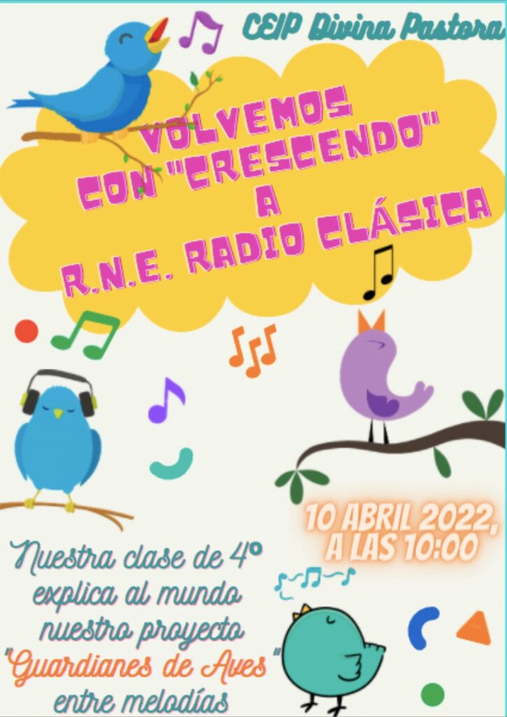 Este domingo, día 10 de abril, a partir de las 10:00 horas, los alumnos de cuarto curso de Primaria del CEIP Divina Pastora se asoman a las ondas de Radio Nacional de España, Radio Clásica.