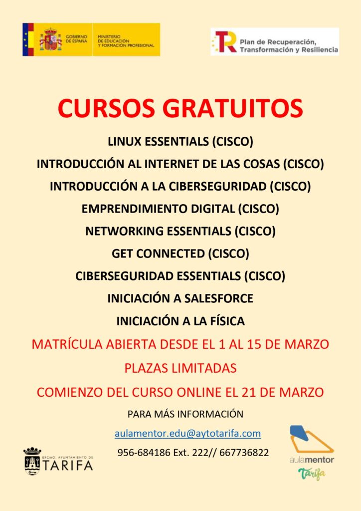 Para más información: aulamentor.edu@aytotarifa.com. 956 684186 Ext.222/ 667 736 822