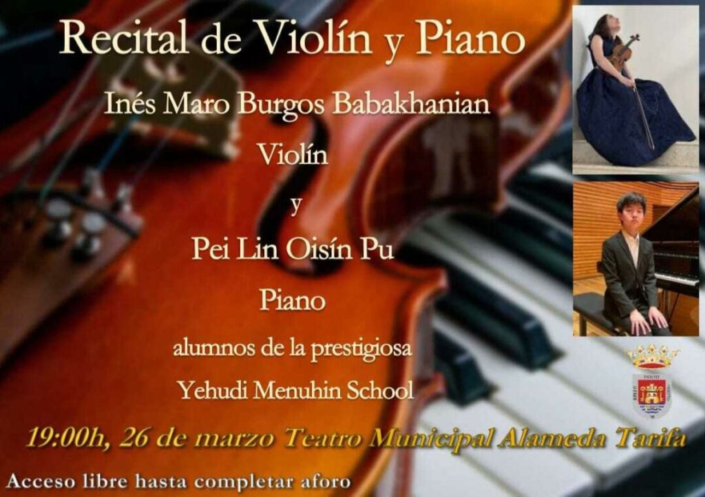 La delegación de Juventud del Ayuntamiento de Tarifa ha organizado un evento musical en el Alameda, donde se presentarán dos jóvenes virtuosos, Inés Maro Burgos, al violín, y Pei Lin Osín, al piano. Estos talentosos músicos se están formando en la «Yehudi Menuhin School», una escuela inglesa de gran prestigio en el ámbito de la enseñanza musical, reconocida por impulsar a jóvenes talentos emergentes.