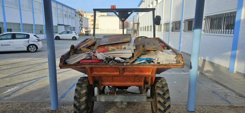 Se ha efectuado la recogida de una gran variedad de residuos sólidos y líquidos, tales como cartones, material escolar obsoleto, libros, sillas y mesas deterioradas, contenedores plásticos y restos de pinturas y sus útiles.