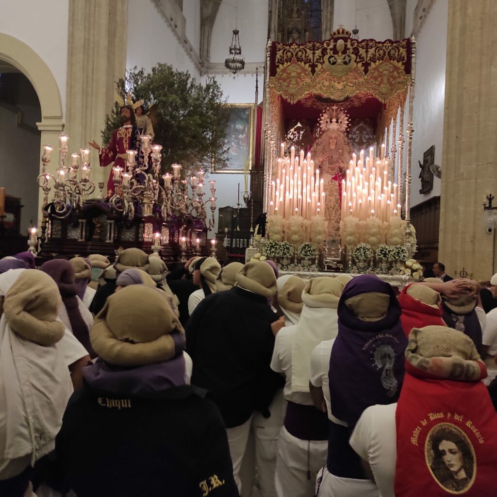 Dentro de la Iglesia de San Mateo, el equipo de capataces con Antonio Valencia al frente, hizo varias «levantás» y su pequeña Estación de Penitencia en el interior del Templo, acompañados por sus hermanos cofrades, dejando posicionados a los pasos del Señor orante y su Madre del Rosario dando su divinas caras a un todo un pueblo que los esperaba en la calle.