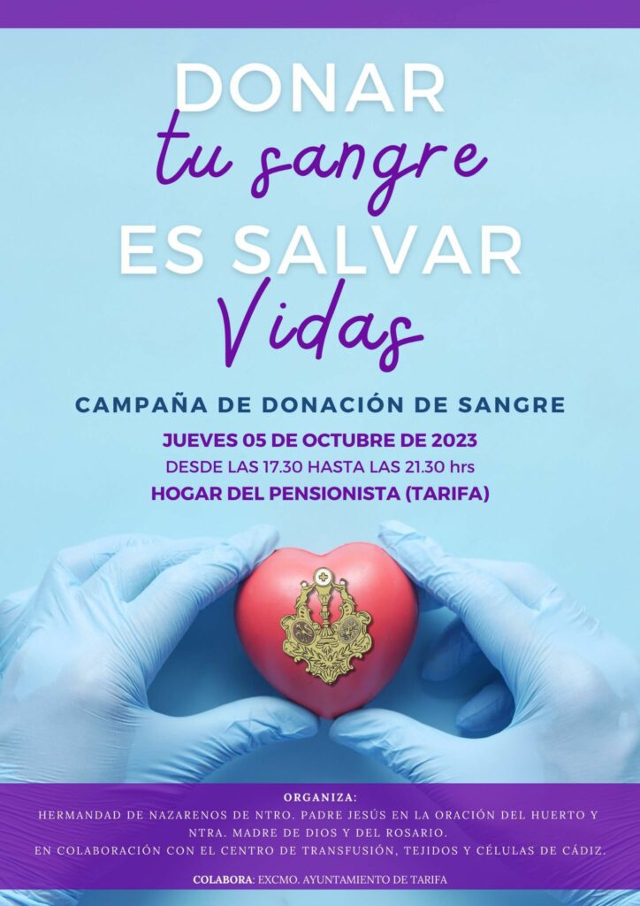 El segundo de los actos programados por la Cofradía, será también en colaboración con el Excmo. Ayto. de Tarifa, la campaña de donación de sangre, bajo el lema “Donar tu sangre es salvar vidas”, tendrá lugar el día 5 de octubre desde las 17:30 hasta las 21:30 horas en el Hogar del Pensionista, sito en Paseo del Retiro s/n.