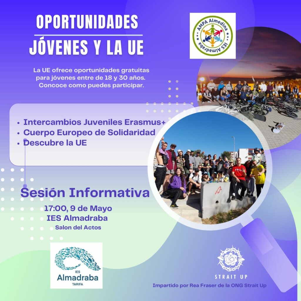Para que los interesados puedan conocer de primera mano todos los detalles de estas oportunidades y proyectos, el AMPA del IES Almadraba de nuestra ciudad, en colaboración, y de la mano de Rea Fraser de la ONG Strait Up, organiza una sesión informativa abierta para el próximo 09 de mayo a las 17:00h, que se celebrará en el Salón de Actos del mencionado Instituto tarifeño.