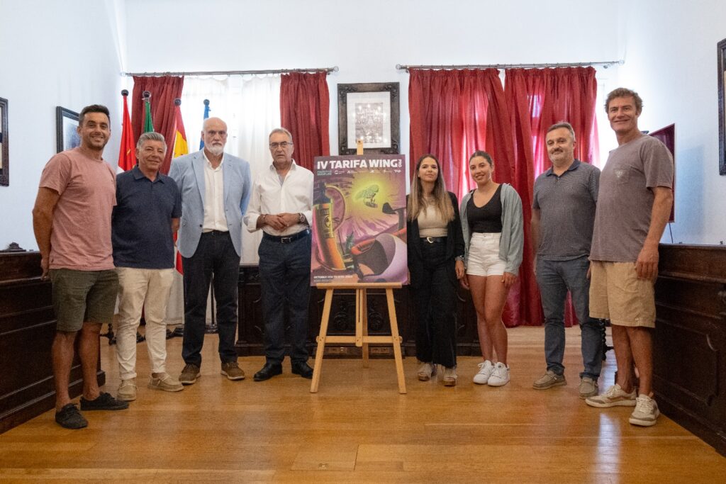 El Alcalde Jose A. Santos, la Concejala de Deportes Celia Rico, los Teniente Alcalde Jorge Benítez y Nacho Trujillo, acompañados del Diputado de Deportes, Javier Vidal, acompañados de la tarifeña Nía Suardiaz y dos organizadores del evento, hicieron la presentación oficial del Cartel de este IV Tarifa Wing Pro.