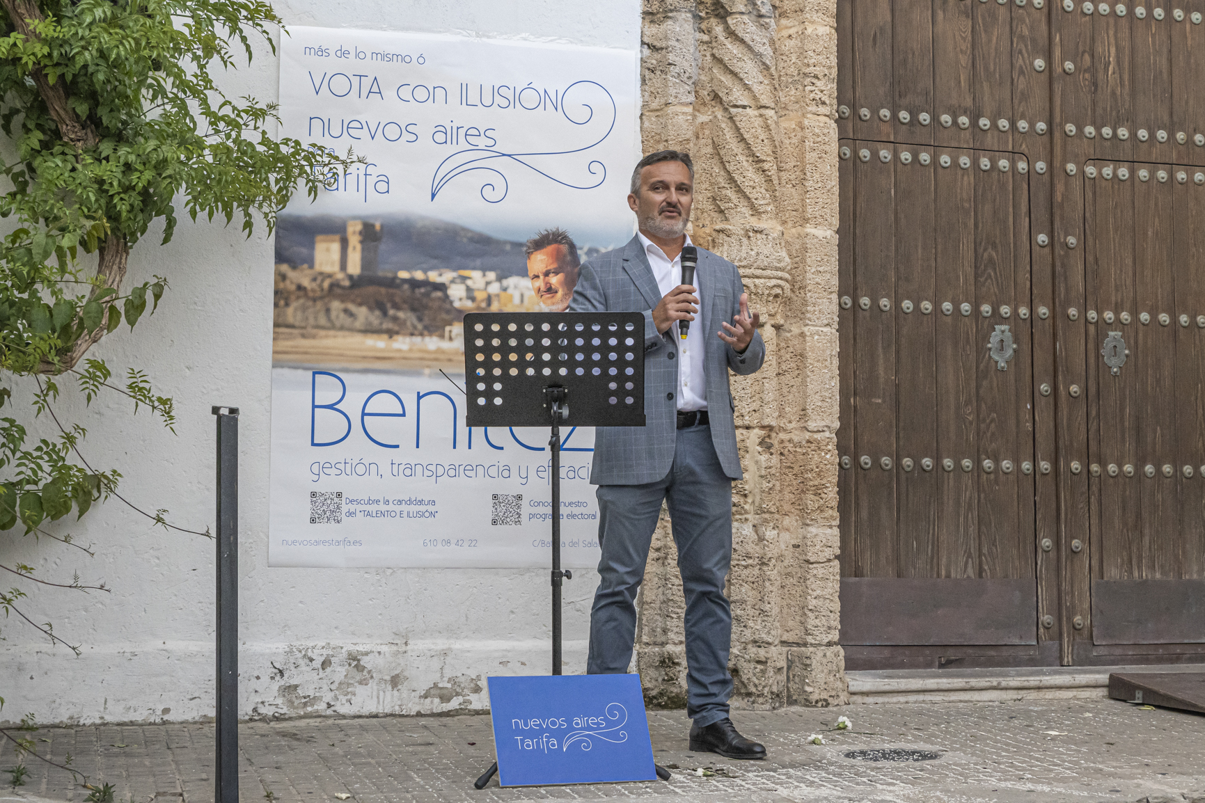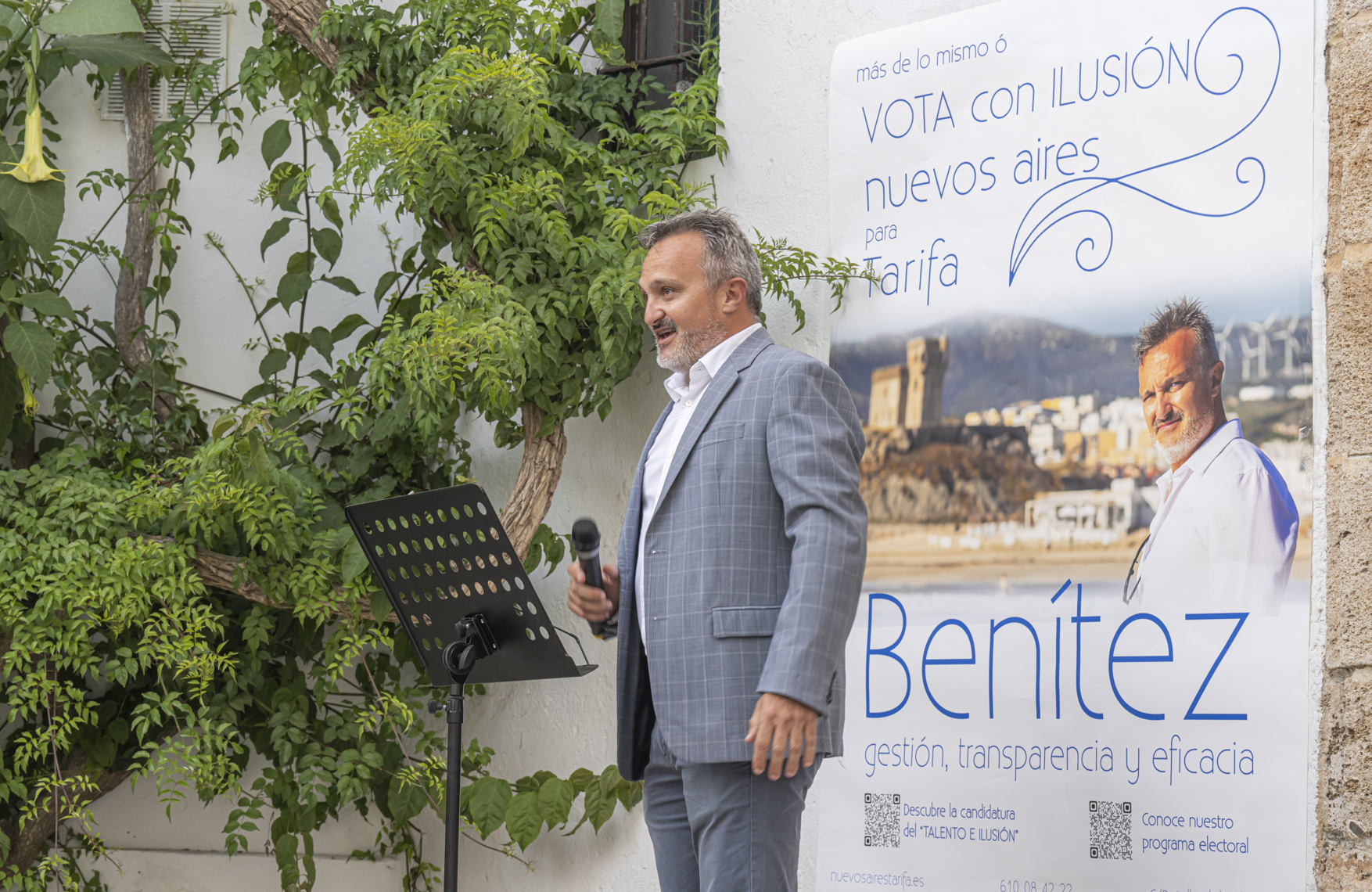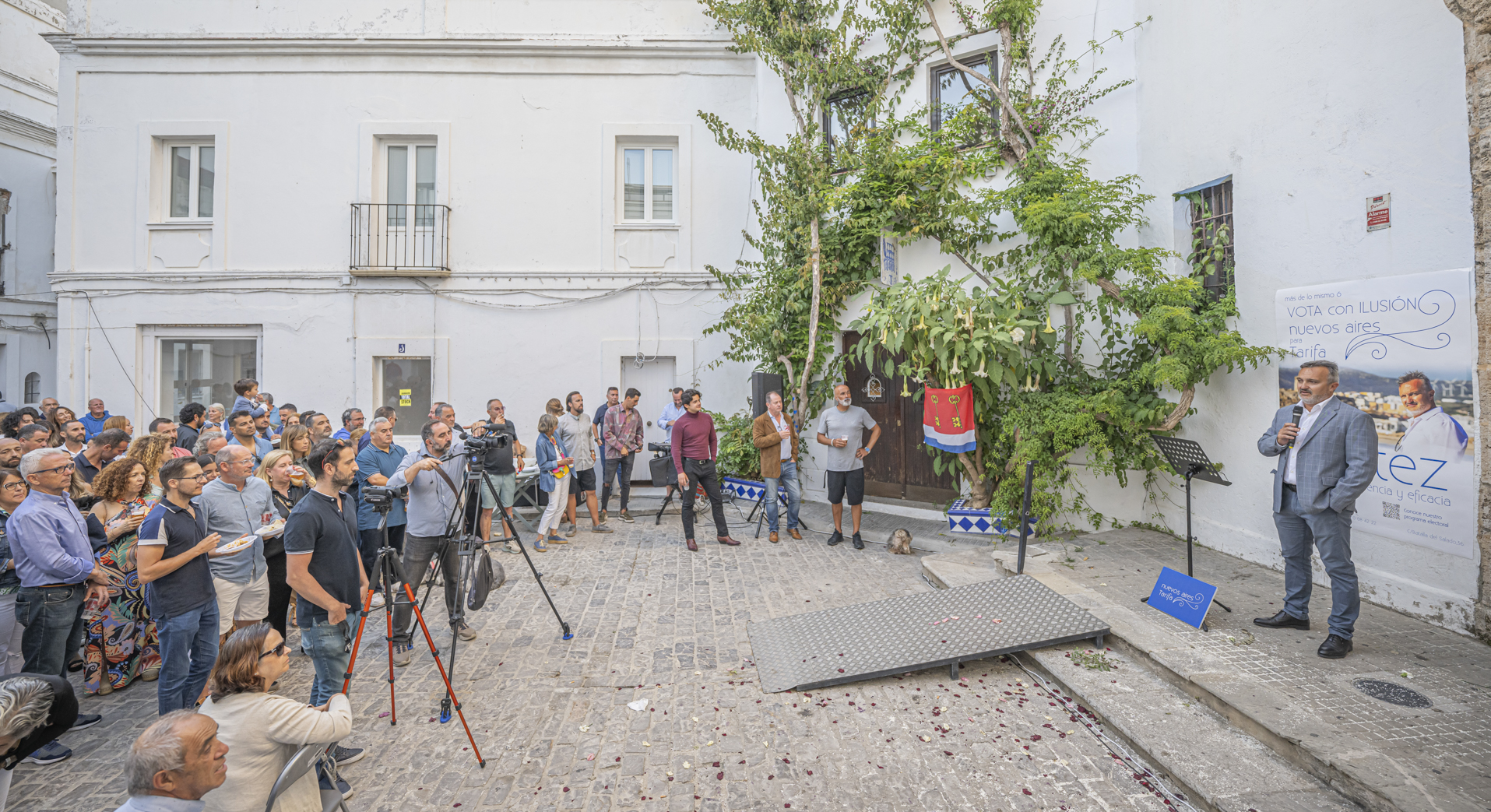 Ayer Benítez micrófono en mano y sin papeles, en una repleta Plaza del Ángel y ante una audiencia diversa y desenfadada, que le arropó en todo momento, se presentó la candidatura del nuevo partido localista e independiente nuevos aires Tarifa. FOTOS TOMOYUKI HOTTA