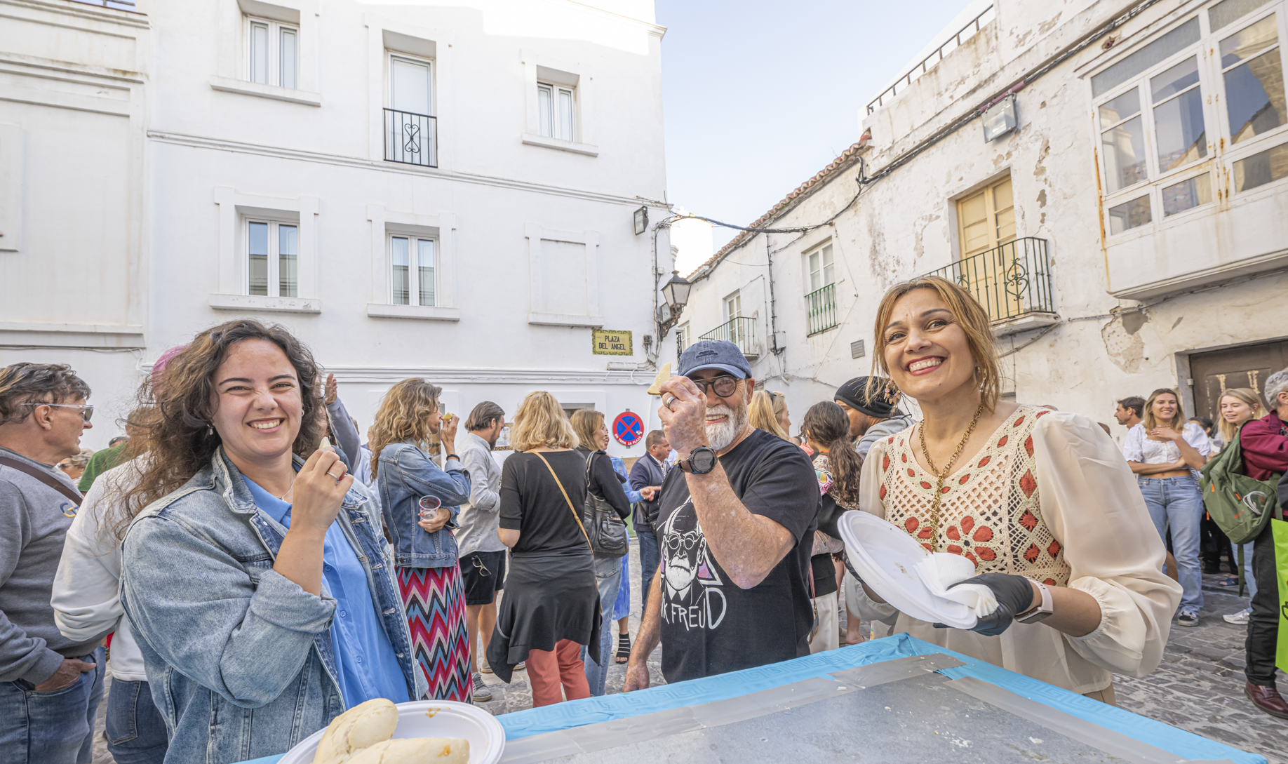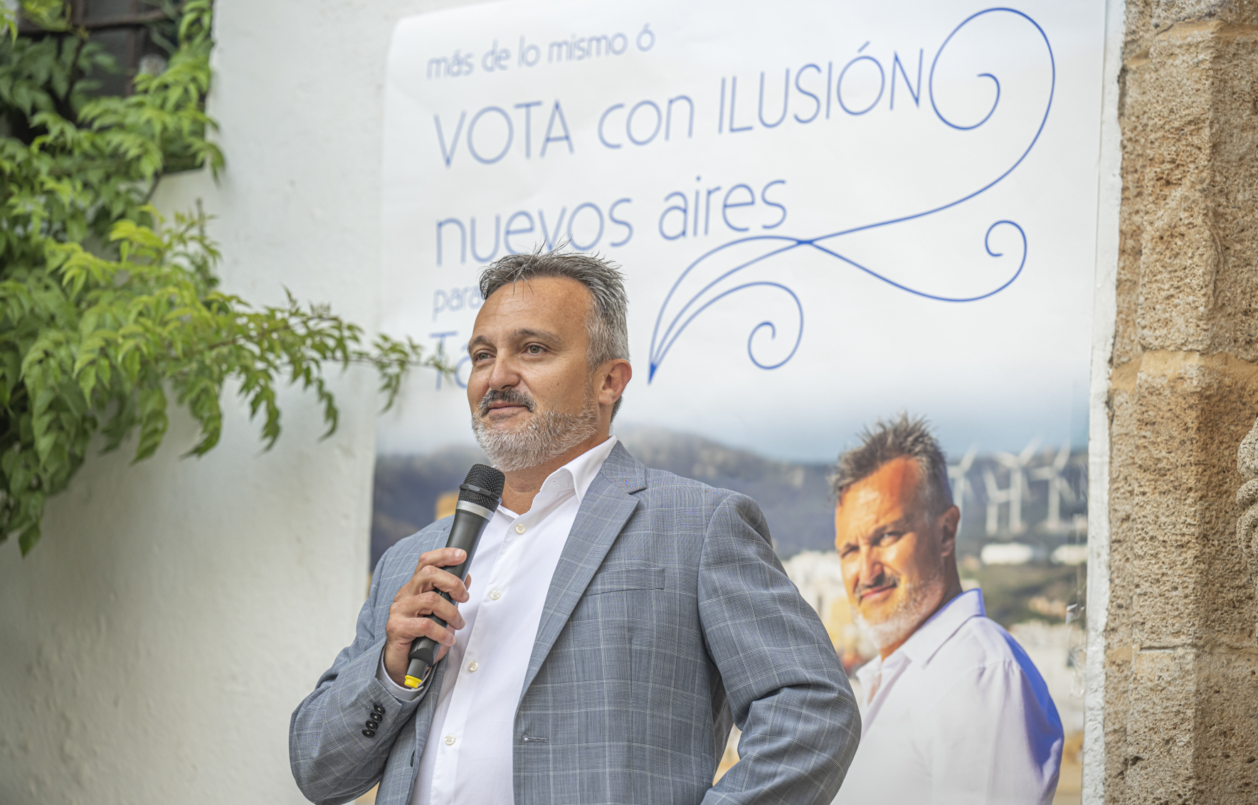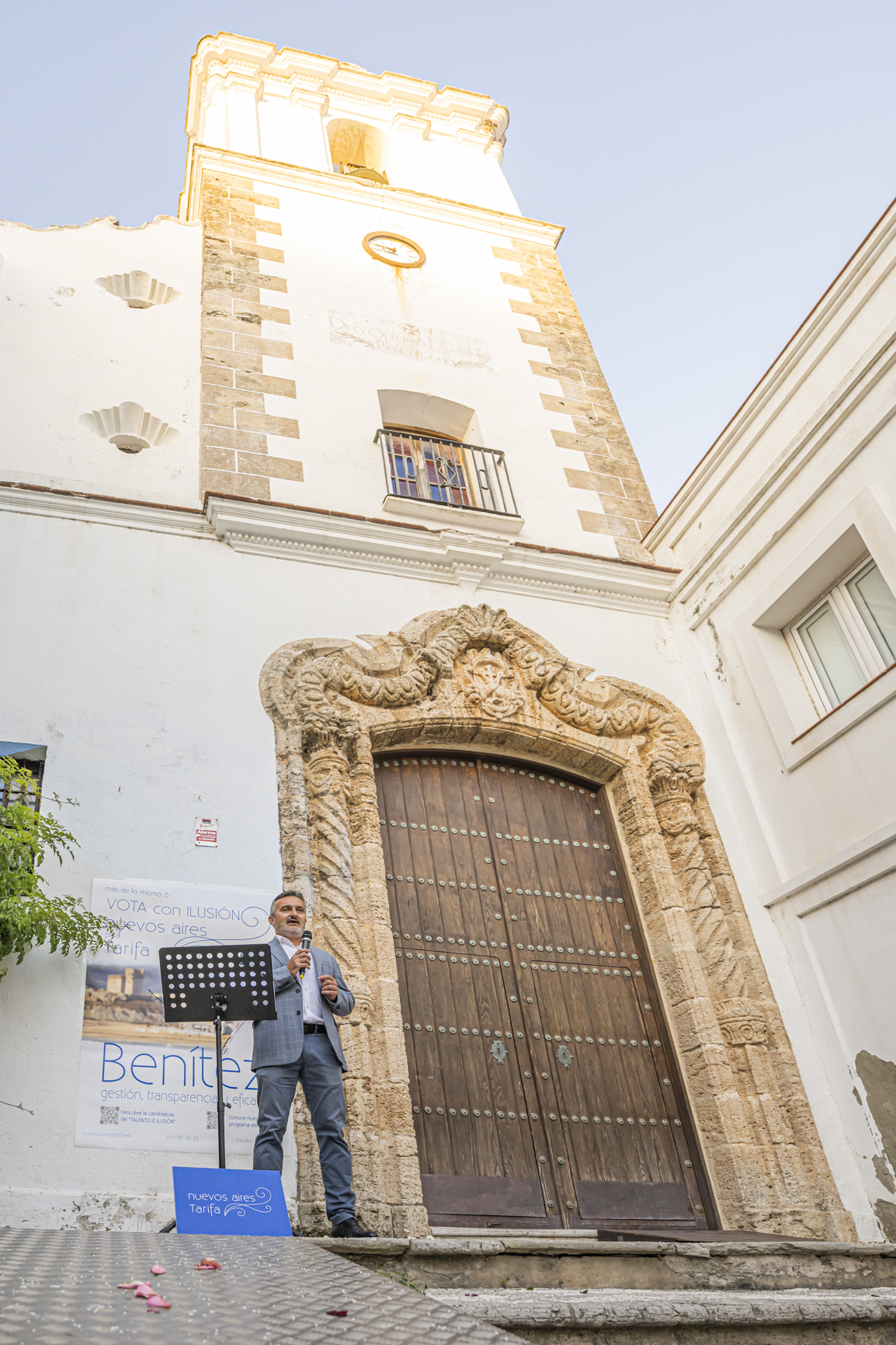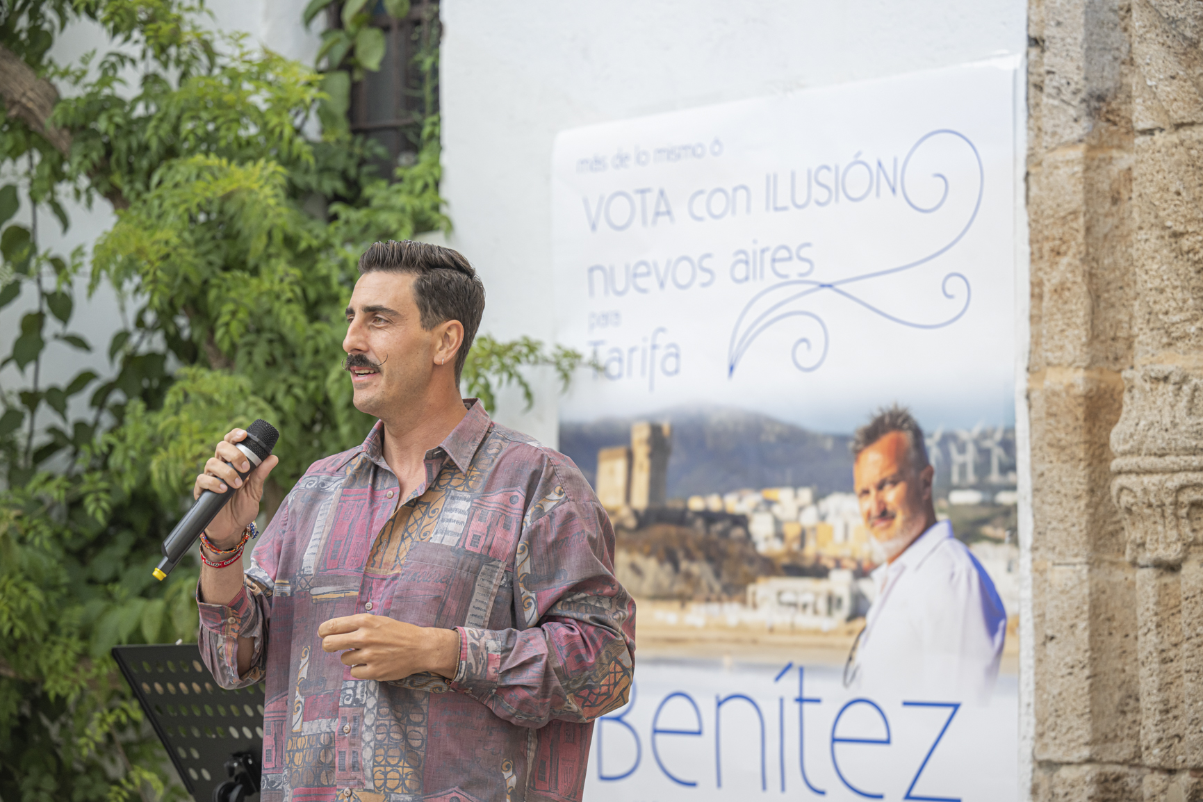 Ayer Benítez micrófono en mano y sin papeles, en una repleta Plaza del Ángel y ante una audiencia diversa y desenfadada, que le arropó en todo momento, se presentó la candidatura del nuevo partido localista e independiente nuevos aires Tarifa. FOTOS TOMOYUKI HOTTA