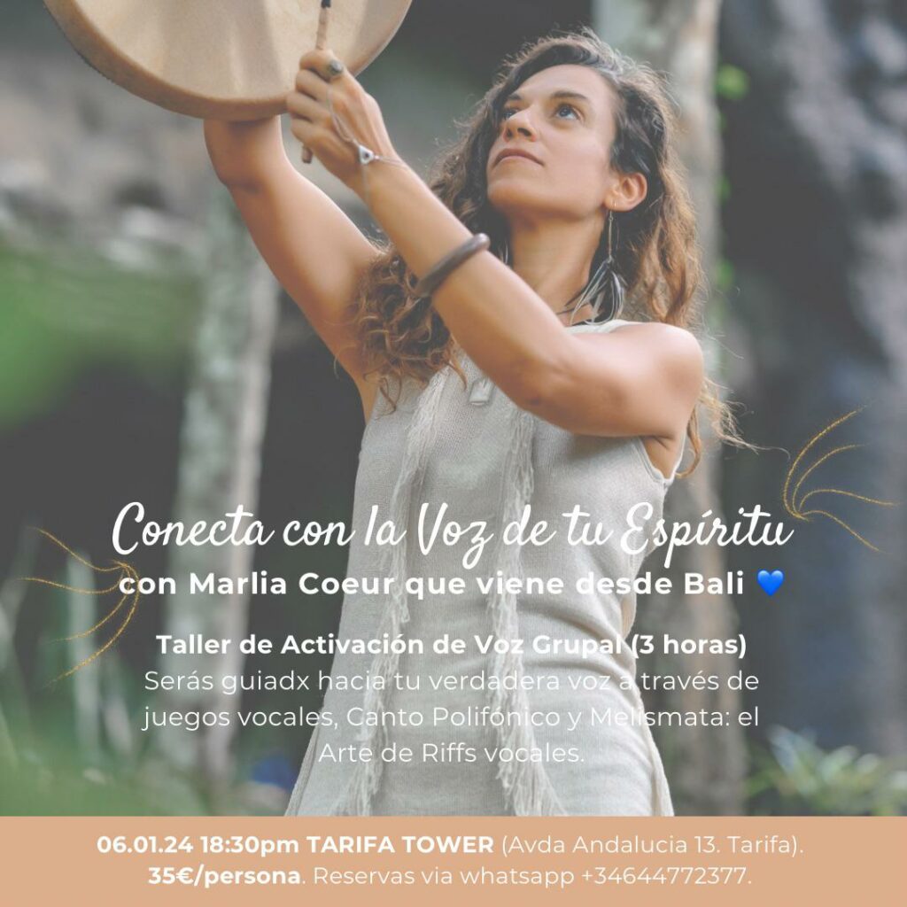Evento especial para el 6 de Enero: ACTIVACIÓN DE VOZ Y VIAJE SONORO. Con Marlia Coeur, que llega desde Bali para compartir unos días con nosotros en Tarifa. Su trabajo es impecable y ha ofrecido cientos de conciertos en todo el mundo, así como ayudado a miles de personas a reconectar y desbloquear su voz. Tanto si has hecho un trabajo asì, como si no o incluso si eres facilitador/a en la materia, es una actividad que se recomienda al 100%. ¿Dónde? Tarifa Tower (Avda Andalucía 13-15) el 6 de Enero 2024 de 18:30 a 21:30 horas. Plazas limitadas. Contacta por whatsapp para reservar. +34644772377