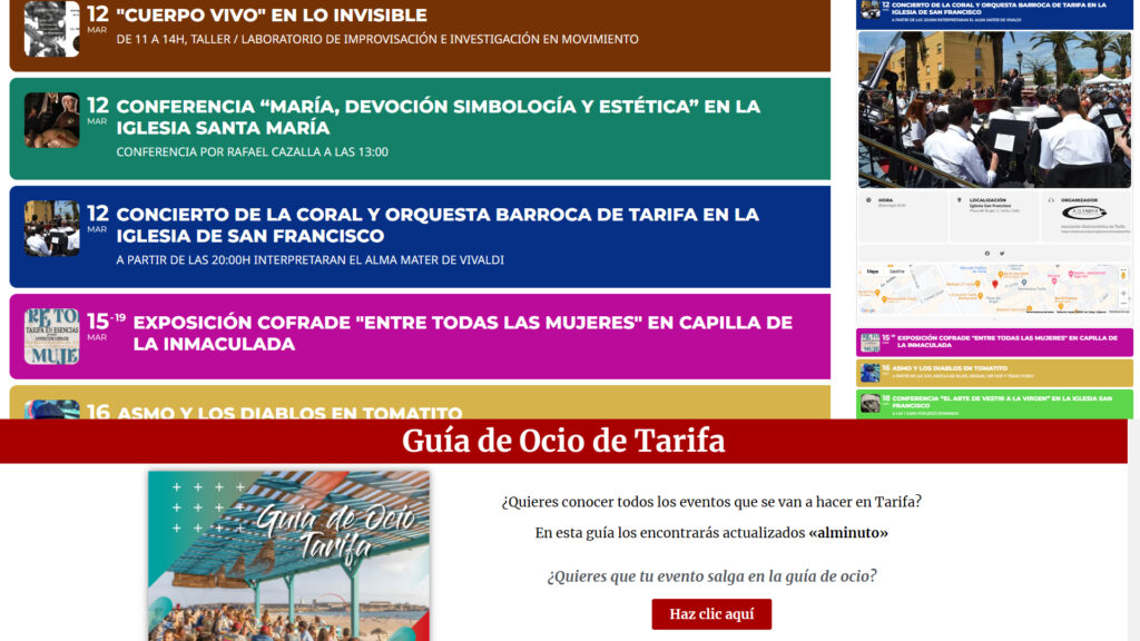 Varias preguntas reiterativas en Tarifa quedan solventadas ¿Qué hay este finde? ¿Dónde es? ¿A q hora? La apuesta de Tarifa alminuto es definitiva, toda lo que necesitas saber sobre la oferta del ocio en Tarifa, estará actualizada a diario y disponible a un solo click desde tu móvil.