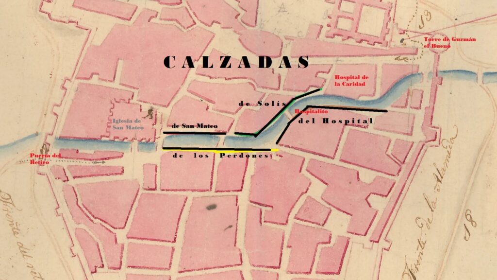 «Plano de Tarifa en 1824, con el recorrido y extensión de las cuatro calzadas. Obsérvese la ubicación de los puentes intramuros»