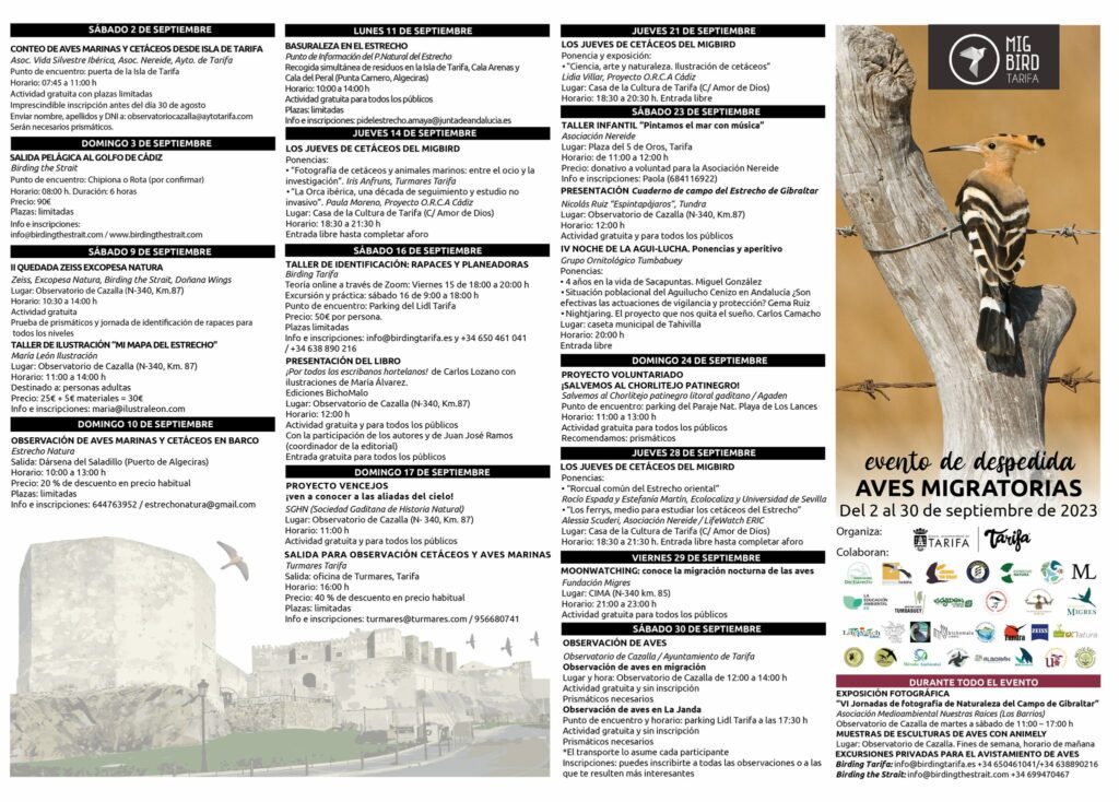 Del 2 al 30 de septiembre Tarifa acoge de nuevo el evento anual de despedida de aves migratorias (Migbird Tarifa), una programación de actividades, talleres, presentaciones de libros y, por supuesto, disfrute de la naturaleza, con el objetivo de entender mejor y conocer la riqueza de la avifauna, sus movimientos migratorios, amenazas y curiosidades.