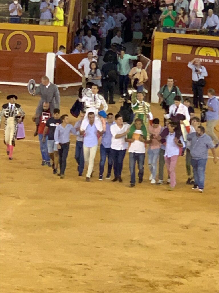 Finalizando el festejo con los tres toreros a hombros y el mayoral de la ganadería Felix Majadas.