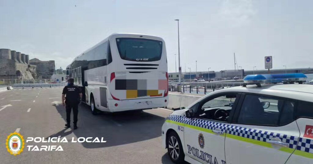 La Policia local de Tarifa denuncia en el Puerto de Tarifa al conductor de un autobús con pasajeros por una tasa de 0.61 mgr/l cuando la tasa permitida para un conductor profesional es de 0.15 mgr/l.