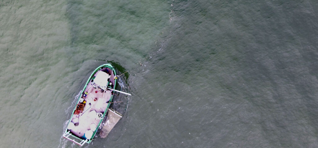 Un buque limpia la basura flotante acumulada a lo largo de una hilera en el Golfo de Vizcaya. © Rivages Pro Tech, Suez Eau France.