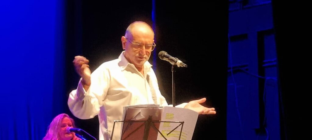 “Cuando llegaban los amigos de mis hermanas, mi madre arrojaba por el balcón polvorones y pestiños…”, “mientras en Madrid se volvían locos por el besugo de la pinta, en casa cenábamos pavo que mataba mi tío Antonio en la azotea”, así fue contando sus memorias sobre el escenario de forma enlazada y sin interrupciones. “Y después todos a la misa del gallo en San Mateo”, añadió. Así transcurría la Navidad de la infancia del tarifeño cuya casa familiar distaba pocos pasos de la ejemplar iglesia.