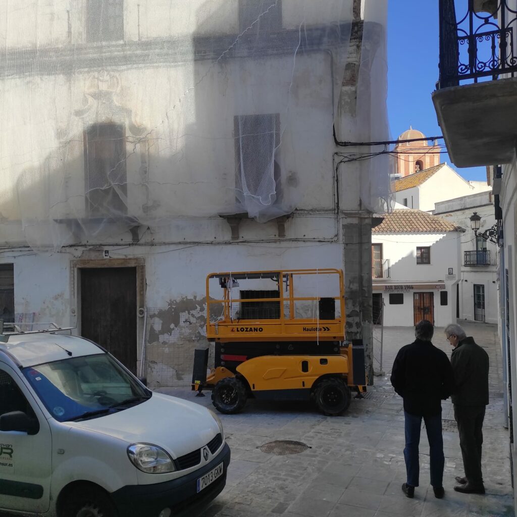 Según informa el Consistorio en su pagina de Facebook, la empresa Protecciones Itálica SL, bajo encargo municipal, deja listos hoy los trabajos preventivos consistentes en la incorporación de una malla protectora por toda la fachada de este edificio, en sus dos caras; una que asoma a la calle de la Fuente y la otra que está justo en la plaza Hermanos Costaleros.