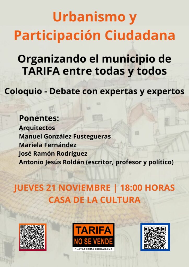 incidir en una población establecida en un sitio determinado. En este sentido, algunas de las cuestiones a considerar por los ponentes de el coloquio-debate del próximo jueves a las 18:00h en la Casa de la Cultura de Tarifa, serán el urbanismo como planificación estratégica en Tarifa; la vivienda pública; la movilidad y la accesibilidad urbana; el desarrollo sostenible; o la conservación del patrimonio natural, histórico y cultural.