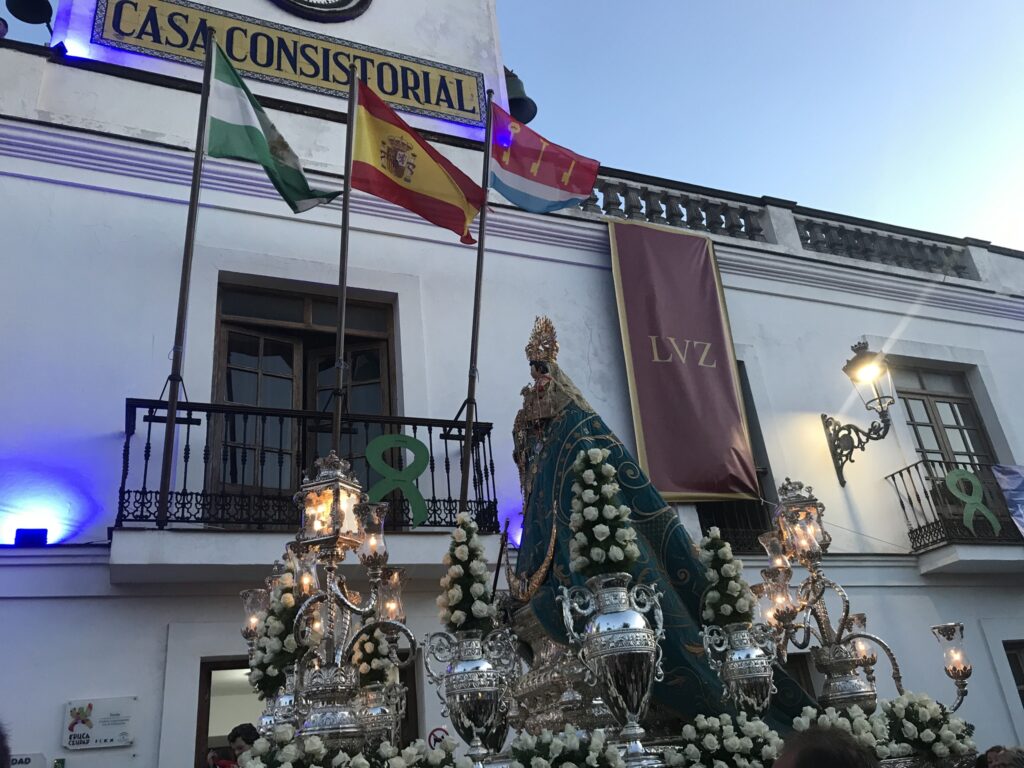 Con arreglo floral de rosas blancas y portada a hombros por la cuadrilla de costaleros de San Isidro Labrador, bajo los sones de la Banda Municipal, Asoc. musical Pintor Manuel Reiné. Así desfila esta tarde por las calles de Tarifa, la Virgen de la Luz con motivo de la conmemoración del 275 aniversario de la proclamación de su Patronazgo.
