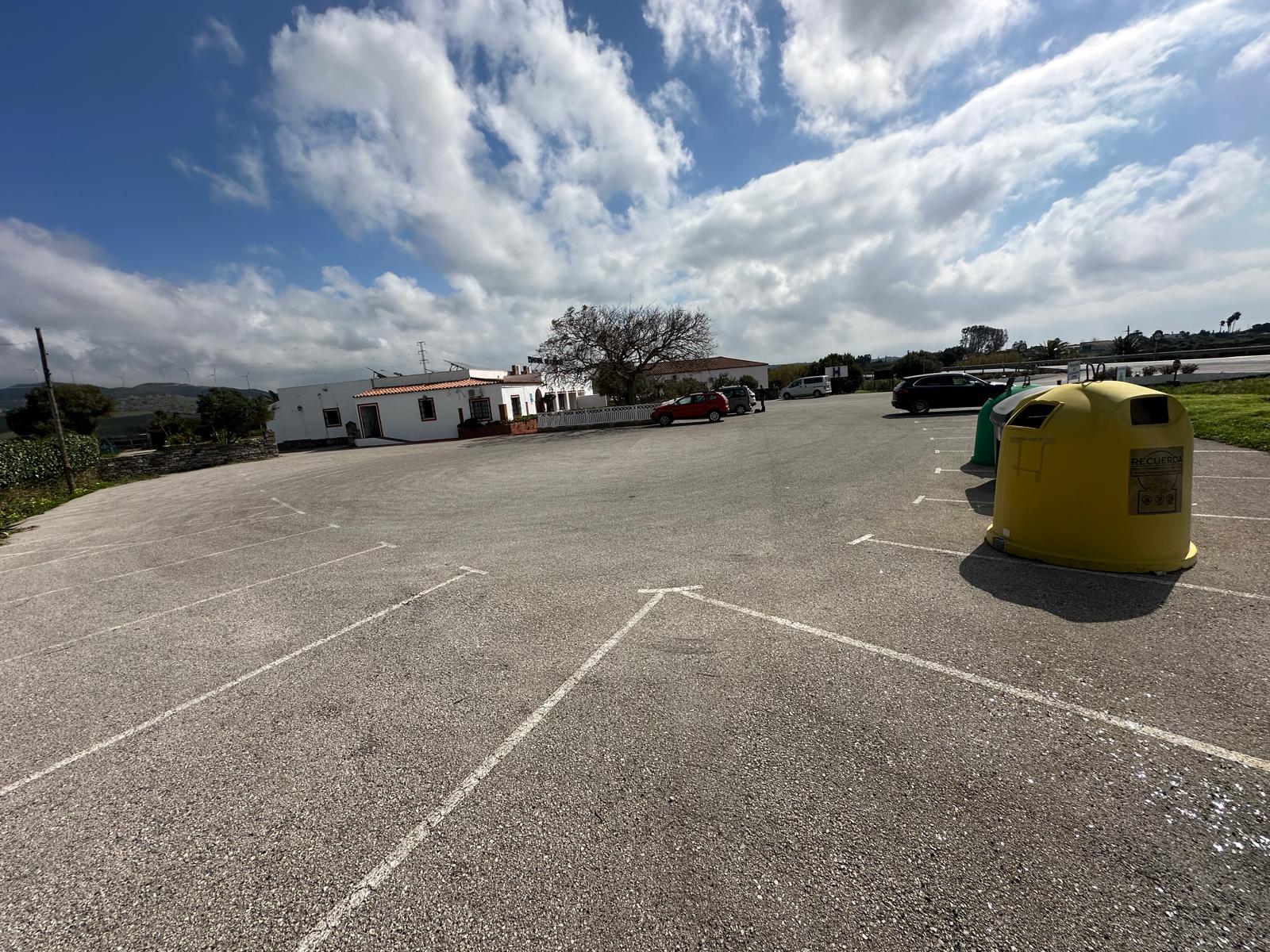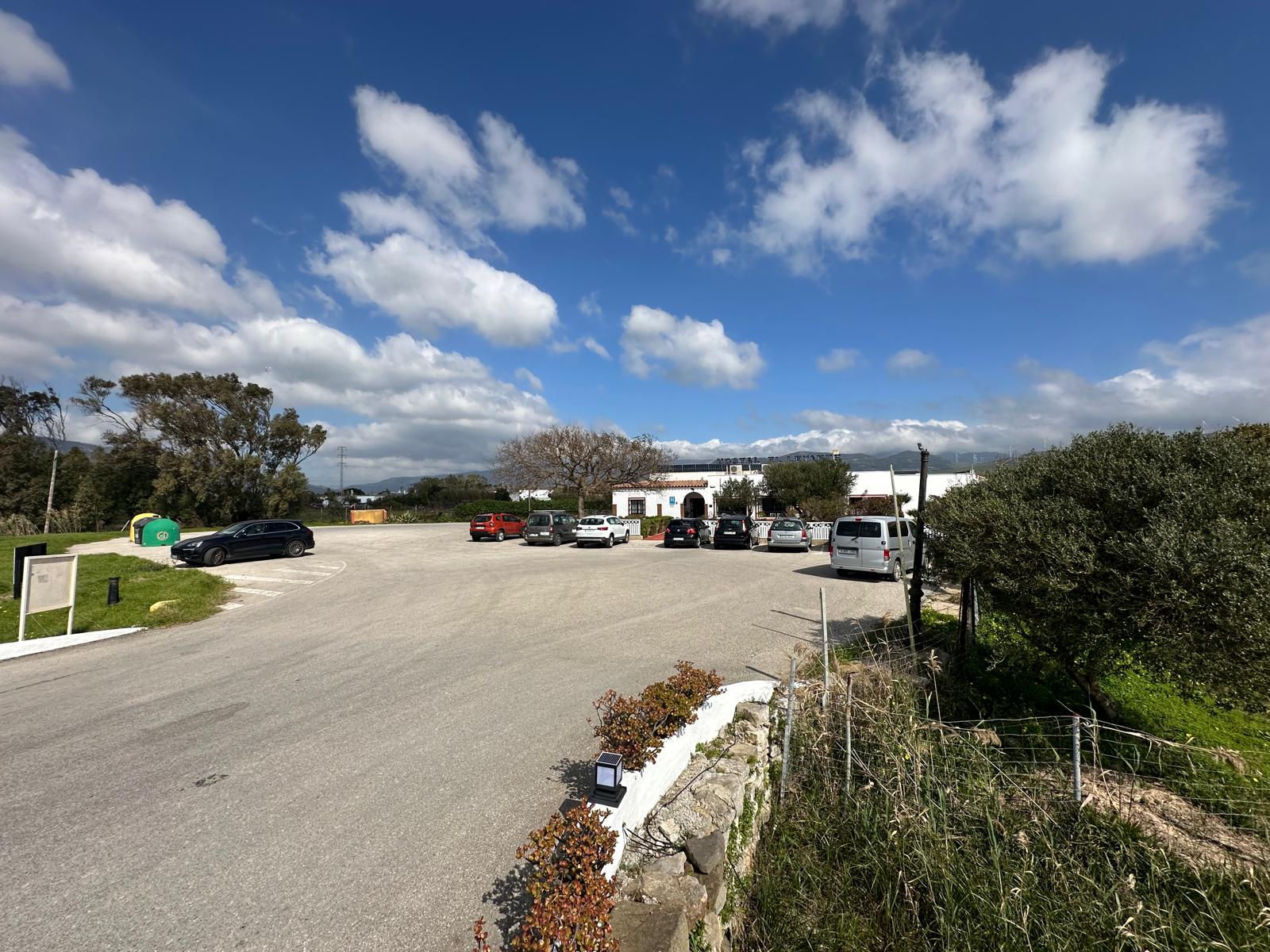 Dirección Cádiz, justo antes del desvío hacia la carretera del Santuario de la Virgen de la Luz. Allí aparece un aparcamiento que, en Tarifa, parece casi un espejismo: amplio, cómodo y reservado para sus clientes. Empezamos bien.