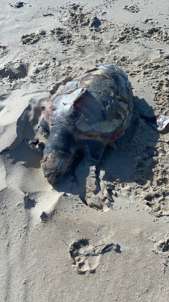 La imagen es de la Playa de Los Lances de esta mañana 10 de marzo y podemos apreciar una tortuga de considerables dimensiones en estado de descomposición. Una imagen poco habitual .