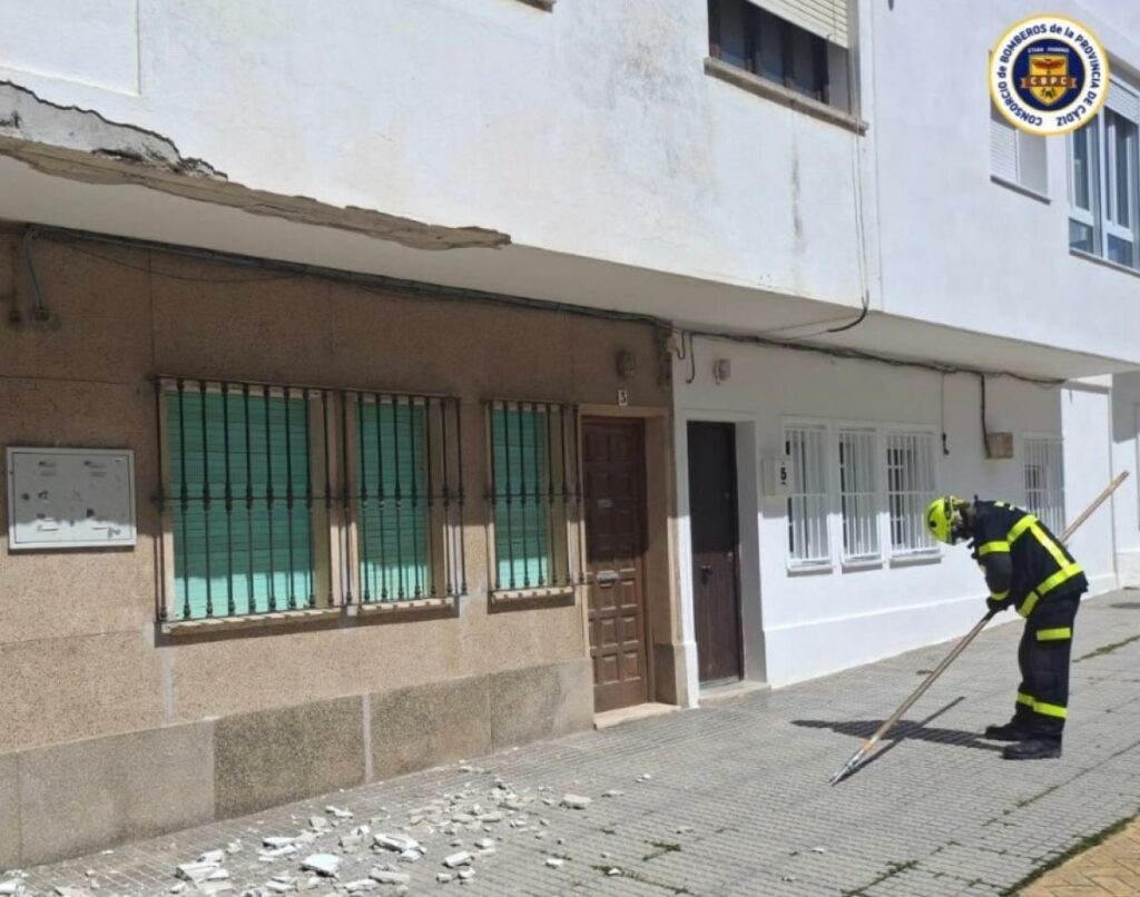 Una dotación del Consorcio de Bomberos de la Provincia de Cádiz realizó una actuación en Tarifa para sanear el enfoscado de un balcón con riesgo de caída en la fachada de un edificio situado en la calle Pintor Manuel Reine.
