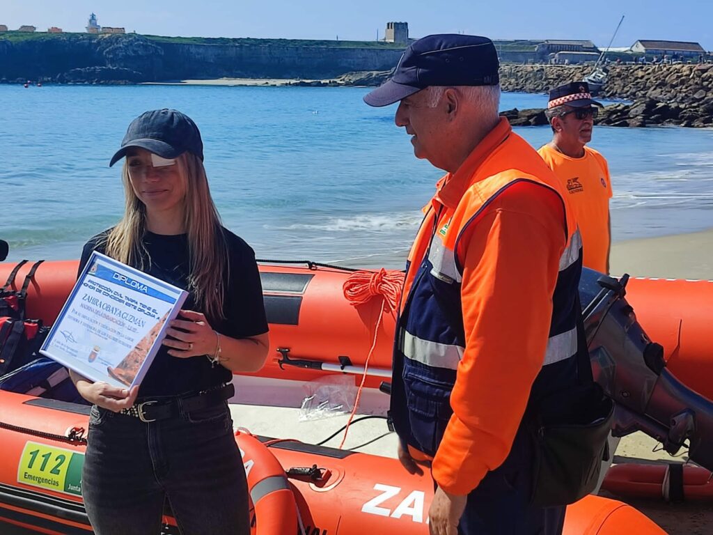 La playa Chica de Tarifa acogía este mediodía la entrada en funcionamiento de la nueva embarcación de asamblea local de Protección Civil. Un equipamiento que hará posible la activación de los voluntarios también en el litoral tarifeño. Lleva el nombre de la joven Zahira Obaya Guzmán, y la tarifeña ha actuado como “madrina de la embarcación LS112” con agradecimiento expreso de la asamblea de voluntarios que le entregaba diploma de reconocimiento y recuerdo.