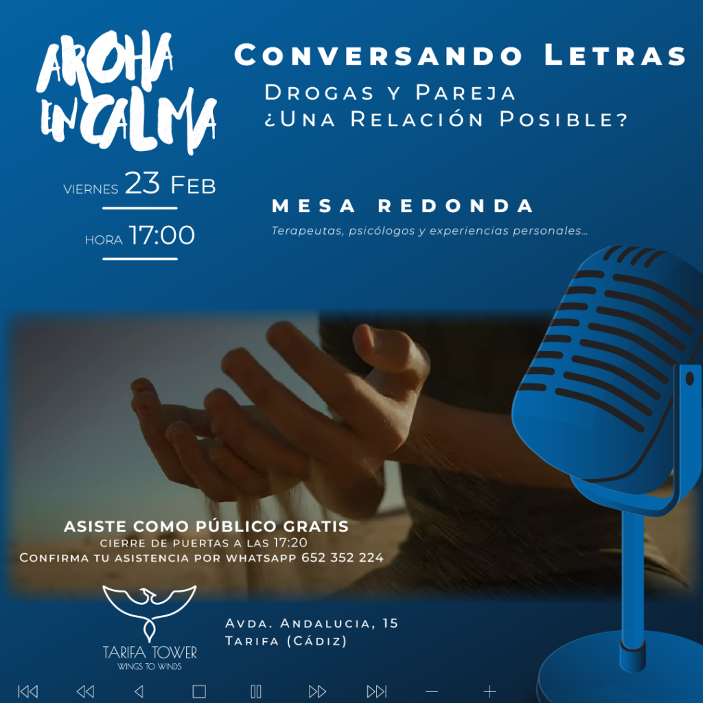 Conversando letras de Aroha en Calma nos llevará este viernes desde las 17.00 h en Tarifa Tower Studios (Avda Andalucía 15) al mundo de las drogas y la pareja, el público asistente podrá participar con preguntas y reflexiones a micrófono abierto. Las plazas son gratuitas y limitadas hasta completar aforo. Tienes toda la información en el cartel.