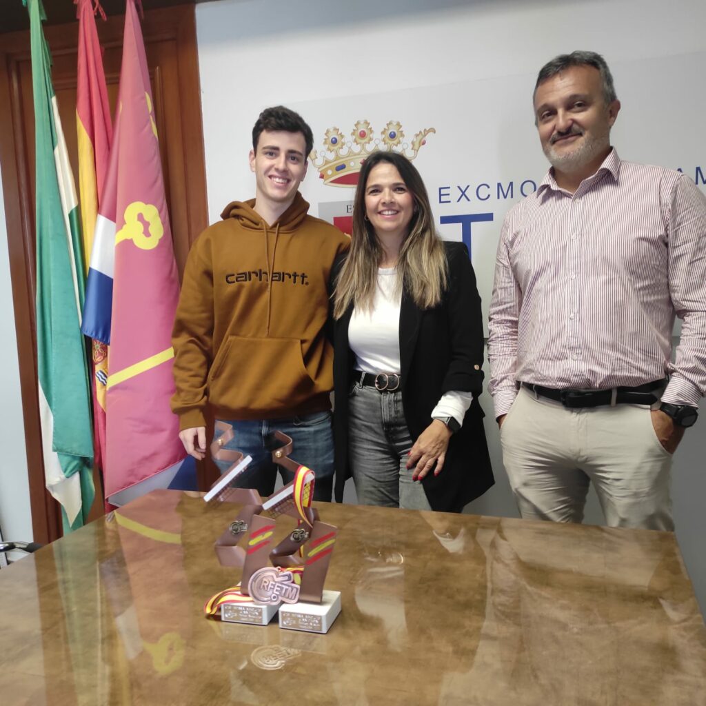 Juan Pérez ha acudido al Ayuntamiento y ha querido enseñar a todos los tarifeños y tarifeñas sus últimos trofeos. No en vano, el joven de 21 años fue Campeón de España de Sub 21 en 2023 y en lo que llevamos de 2024 ya ha conseguido hacerse campeón de España Absoluto en doble y mixto, consiguiendo también la medalla de bronce en individuales.