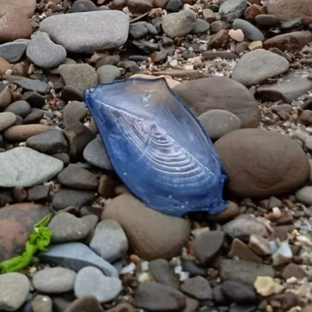 Las «velella velella» son una especie marina de esqueleto gelatinoso de color azul intenso, que utilizan su vela transparente para moverse con el viento (de ahí su nombre), y la buena noticia es que a diferencia de la carabela portuguesa, esta especie NO es venenosa y posee unos tentáculos más cortos.