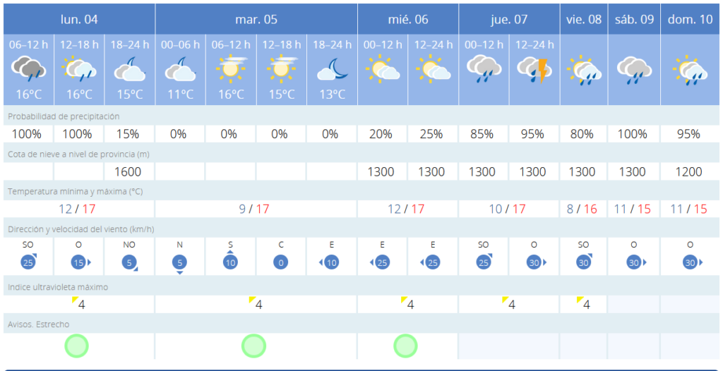 Este jueves es cuando la borrasca alcanzará Tarifa y habrá precipitaciones desde la noche del miércoles al jueves, que durarán todo el día. Ya el viernes, bajarán las temperaturas y volverán los chubascos que no cesarán hasta el domingo como mínimo, alternando claros y nubes durante el fin de semana.