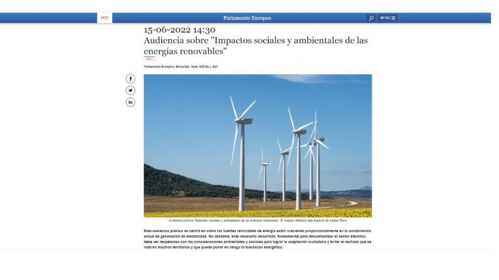 «Nuestra Petición, manifiestan, coincide de forma similar con otras peticiones de diversos países miembros de la Unión Europea por lo cual se ha realizado una audiencia pública que se centró en “cómo las fuentes renovables de energía están creciendo proporcionalmente en la combinación actual de generación de electricidad, donde el necesario desarrollo, fundamental para descarbonizar el sector eléctrico debe ser respetuoso con las consideración ambientales y sociales para lograr la aceptación ciudadana y evitar el rechazo que se nota en muchos territorios y que puede poner en riesgo la transición energética”.