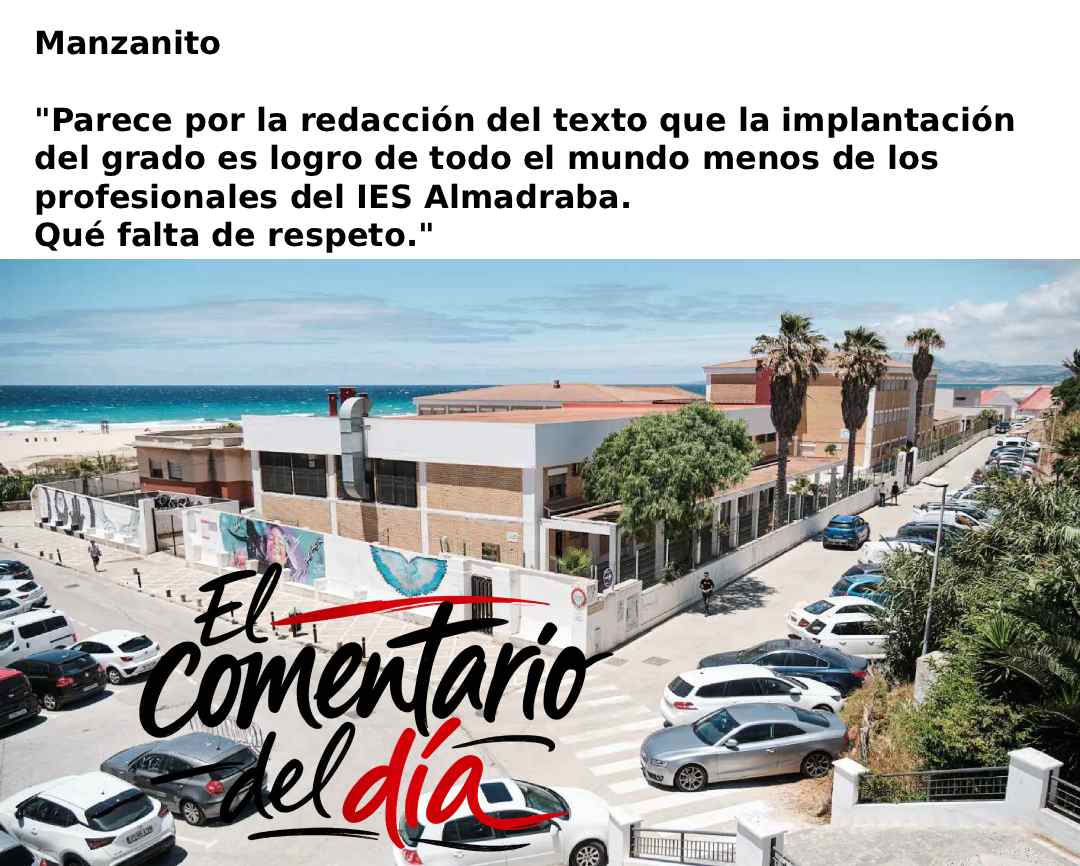 Hoy el comentario del día nos llama la atención, y con razón. Pedimos disculpas sinceras y ofrecemos una explicación. La noticia provenía de fuentes oficiales municipales y en ella el Ayuntamiento se apropiaba en exclusiva del éxito de la implantación del grado que el IES Almadraba impartirá el próximo curso: un Grado Superior en Turismo. Sin embargo, sencillamente no era cierto. El éxito real tenía otros nombres propios que no se citaban en la gestión de prensa municipal, en lo que parece un intento grosero de capitalizar algo que no les pertenece, y mucho menos en exclusiva. Dimos en su momento la información de la que disponíamos; hoy la actualizamos.