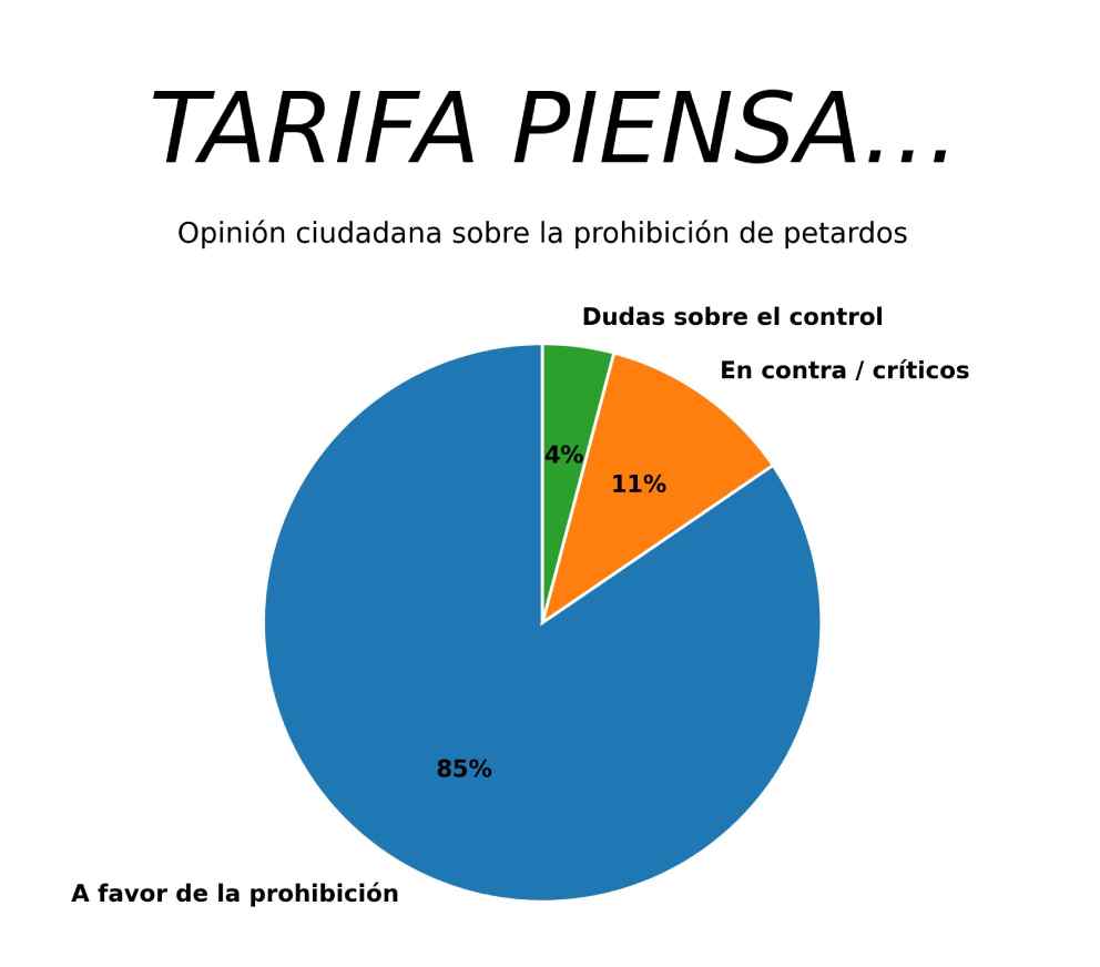 Según este sondeo cualitativo, alrededor del 80–85 % de las opiniones se muestran claramente a favor de la prohibición. Los mensajes destacan, sobre todo, la necesidad de proteger a animales, niños con autismo, personas mayores y ciudadanos con problemas de salud, señalando que el ruido genera miedo, ansiedad y sufrimiento innecesario. Muchos usuarios celebran la iniciativa y reclaman que se extienda a otros municipios e incluso a todo el país.