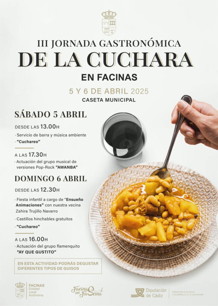 Este fin de semana, del 5 a 6 de abril, vuelve la Jornada Gastronómica de la Cuchara en Facinas. Tarifa Destino Gastronómico estará presente en la cita, estas jornadas serán las protagonistas de la próxima entrega del programa de TV de 7TV emitido para todo el campo de Gibraltar. PRECIOS POPULARES