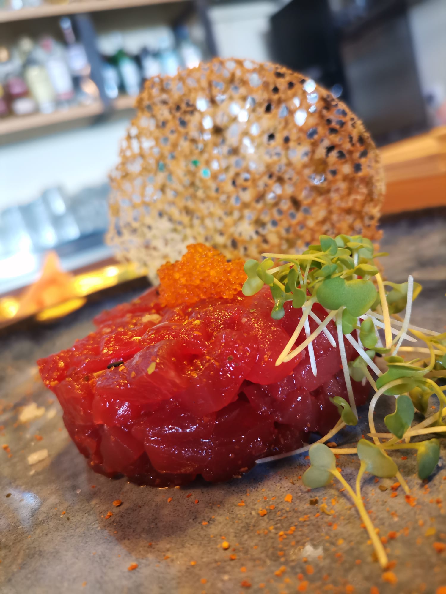 La vida de Rafael está unida al mar. Creció pescando atún junto a su padre, patrón de barco, y ese contacto temprano con el producto marcó el inicio de un camino que culminaría en los fogones. Entró en cocina con 16 años, dejando los estudios para empezar desde lo más básico: limpiar pescado, sacar servicios, coordinar comandas y aprender observando. Su formación fue dura, moldeada “a base de palos”, con muchas horas, sacrificio y una voluntad firme por mejorar.