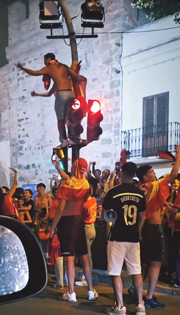 Y es que cuando la euforia invade nuestro cerebro, algunos son capaces de subirse hasta por las paredes. O como en este caso, por los semáforos.