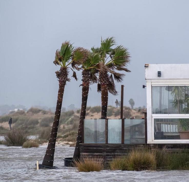 La fotografía, obra de 7uS1, refleja la fuerza del temporal, con rachas de viento que han inclinado la vegetación costera y un notable aumento del nivel del agua en las zonas más próximas al mar. La lluvia fuera de temporada ha sido constante durante varios días, condicionando la actividad en los paseos marítimos y complicando el acceso a algunos establecimientos ubicados a pie de playa.