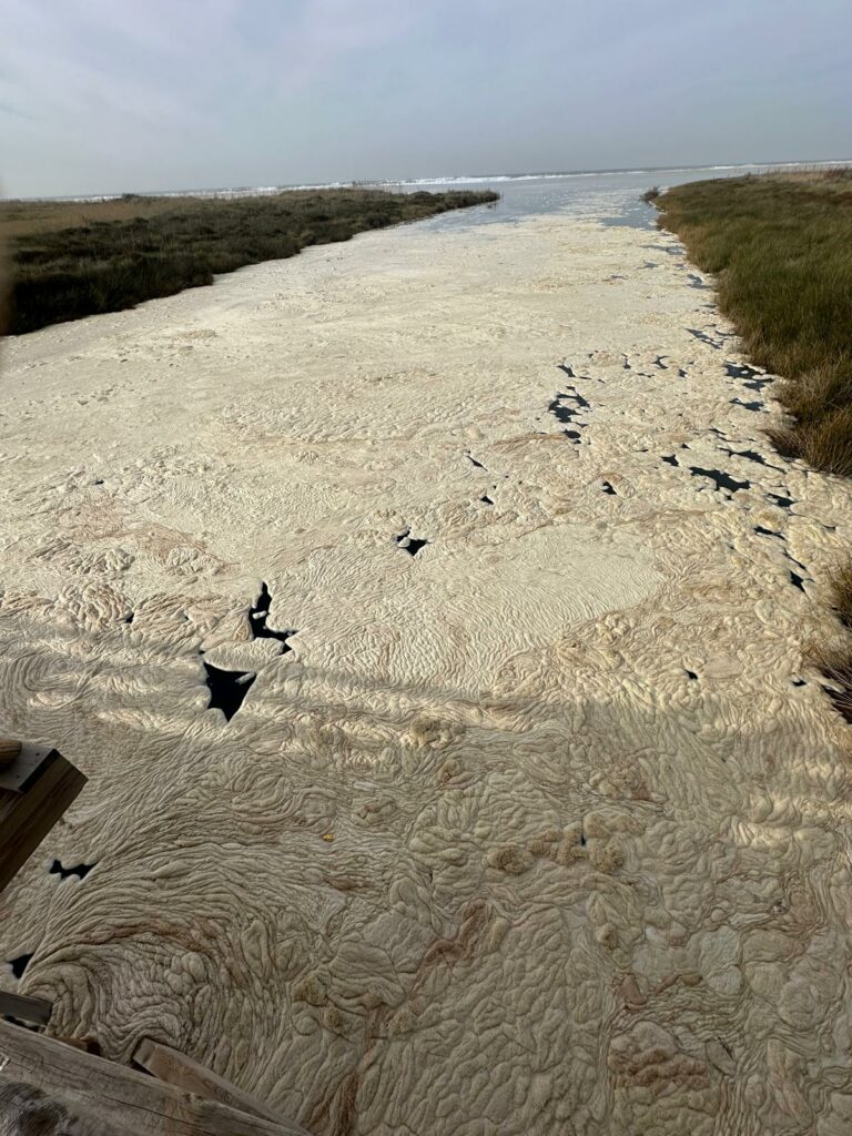 Es un fenómeno poco conocido pero provocado por le mar, parece contaminación pero no lo es, está causado por el oleaje, es la foto del día, un río Jara que parece desembocar espuma y lo hace, pero de manera natural.