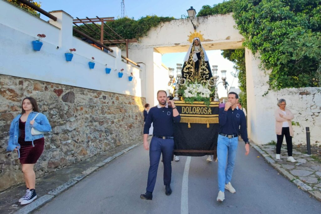 Cristo Crucificado y la Virgen Dolorosa recorren las calles acompañados por la mirada atenta de los vecinos, muchos de los cuales viven con intensidad cada estación del vía crucis. Es un momento de reflexión, de conexión con las raíces y con la fe que ha pasado de generación en generación.