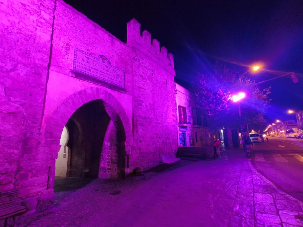 Así lucía anoche la Puerta de Jerez, con el color de una jornada que reivindicaba atención sobre los pacientes y familiares de enfermos de Alzheimer.
